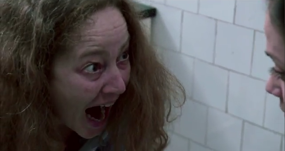 - A medium close up shot denotes a middle aged woman. She appears to be staring into space. The shot helps the audience to identify her face, the audience see she has red eyes. An enigma is raised.